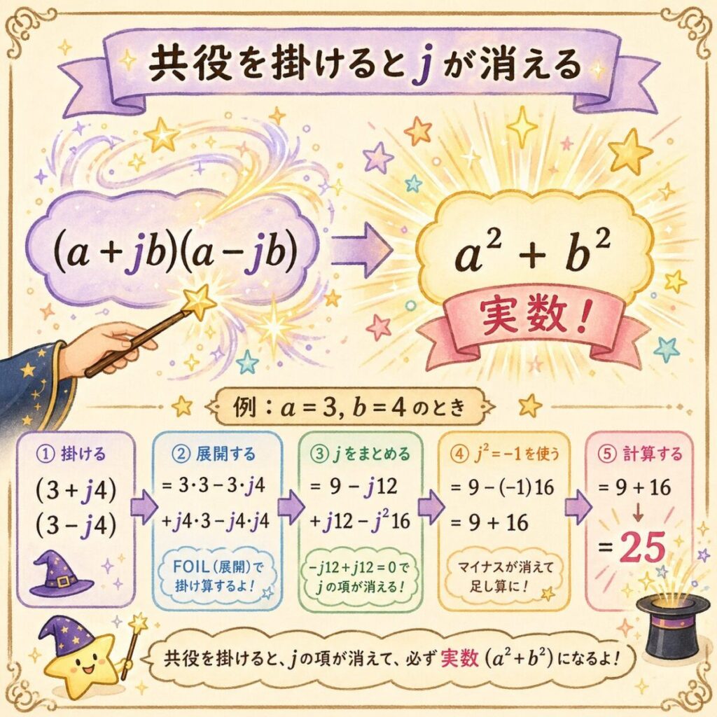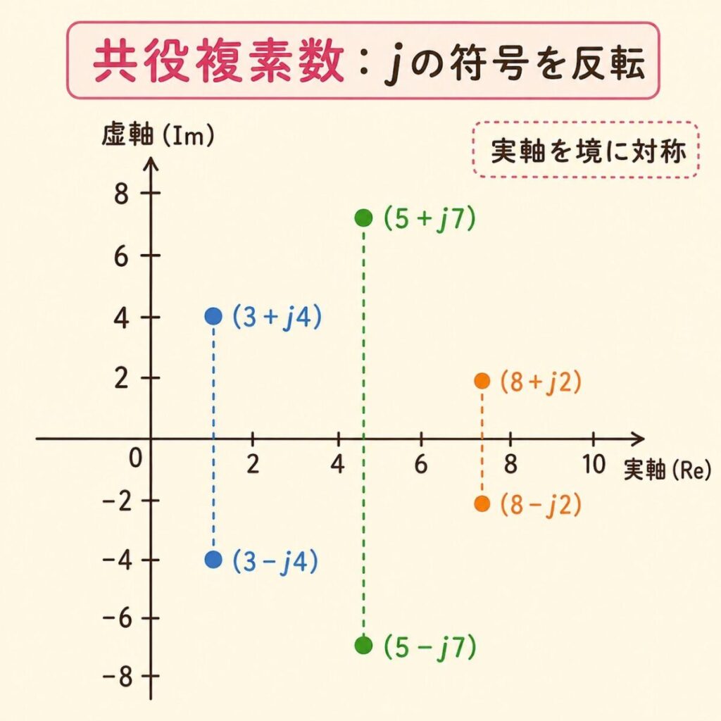 ① 共役複素数 = jの符号を反転したペア。掛け算するとjが消えて実数になる