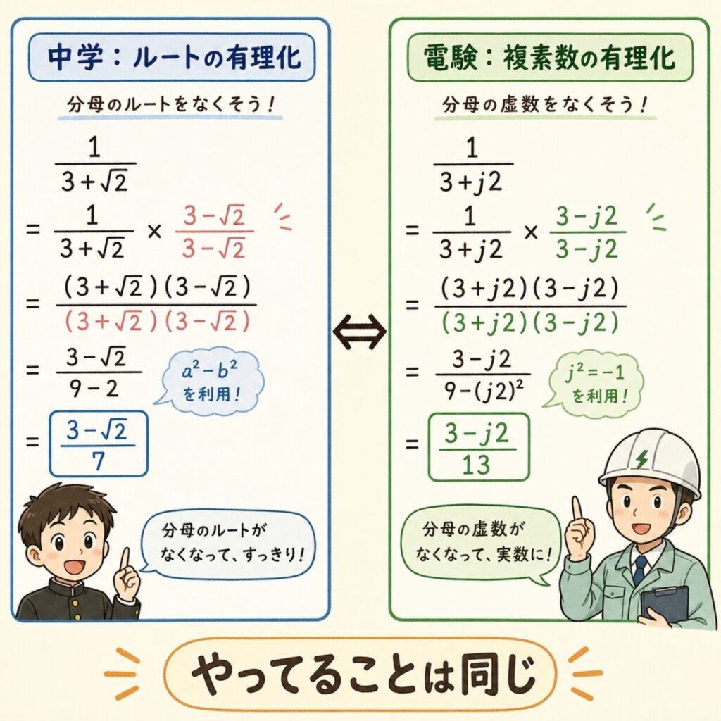 つまり「複素数の割り算」とは、jを消すための有理化作業に他なりません。中学で習った技術の応用版なんです。怖がる必要はゼロ。