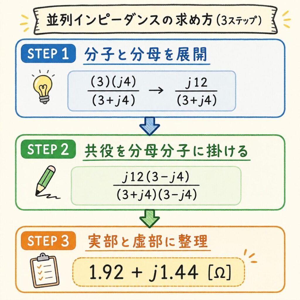 並列ではインピーダンスを掛けたり割ったりしなくていい。アドミタンスを足すだけ。最後にYをZに戻すときに、共役掛けの有理化を1回やるだけです。