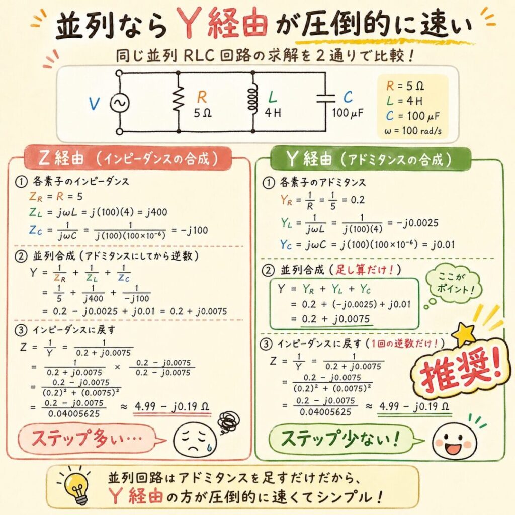 ③ 3素子以上の並列なら、アドミタンスY経由のほうが計算が圧倒的に速い