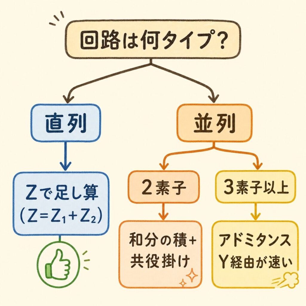 | 並列回路(3素子以上) | Yに直して足し算 → 最後にZに戻す |