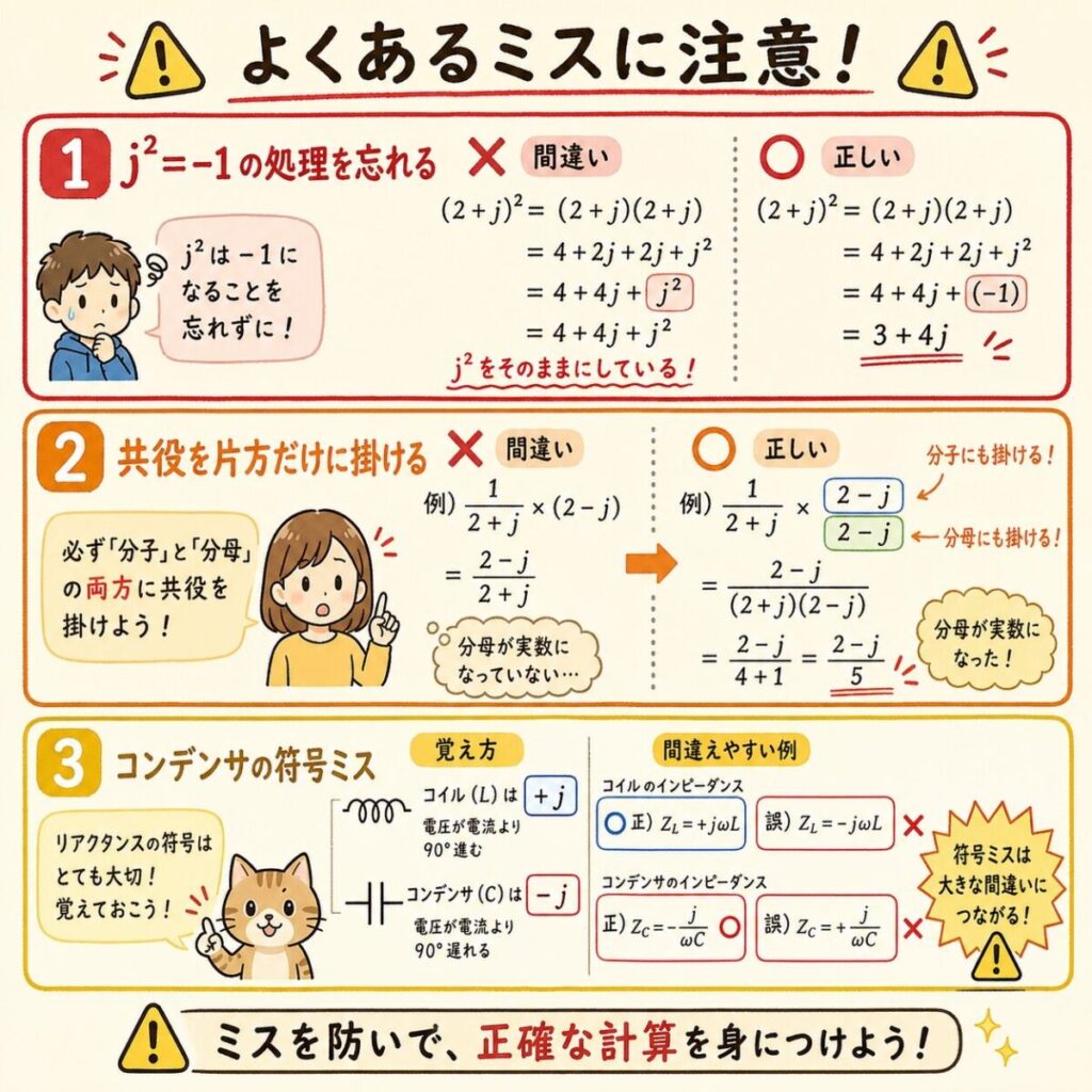 「3 + j7 + j²2」のまま計算するとアウト。必ず最後にj² → −1 の置換を確認しましょう。