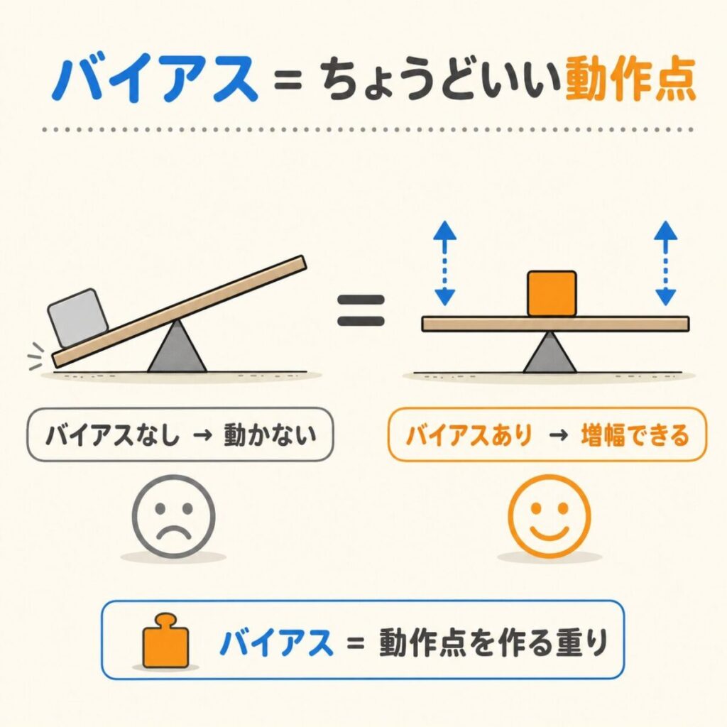 バイアスは「シーソーをまっすぐに保つ重り」のようなもの。シーソーが地面につくほど傾いていたら、軽く押しても動かない(=増幅できない)。最初に「ちょうど水平」になるように重りを乗せておけば、軽い力で上下に振れる(=増幅できる)。バイアス回路は、この「最初の重り」を設定する装置なんです。
