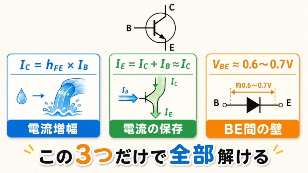 - 計算の3つの基本式:IC=hFE×IB / IE≈IC / VBE≈0.7V