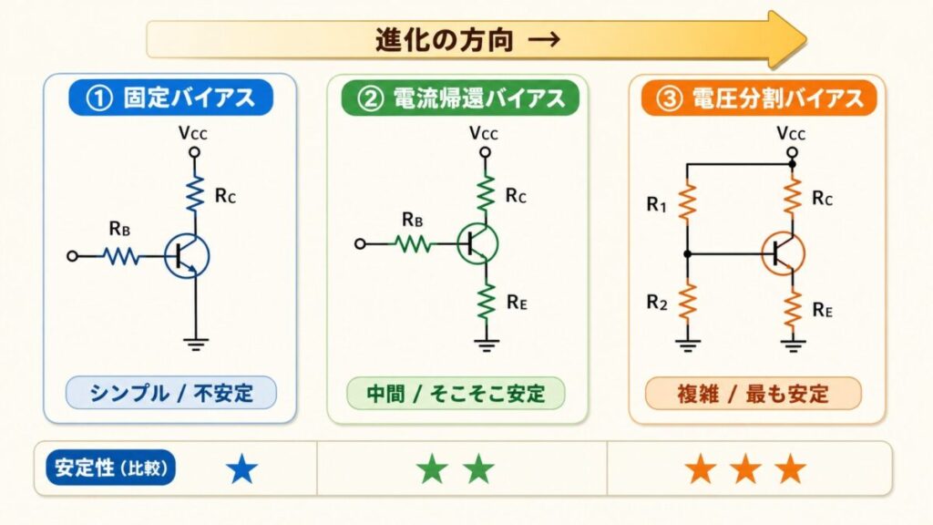 ①固定バイアスは「とりあえず動く」最初のアイデア → でも温度で値がブレる → ②エミッタ抵抗を追加して安定化 → ③さらに分圧抵抗で完璧な動作点を作る、という流れ。試験では3種類とも出ます。
