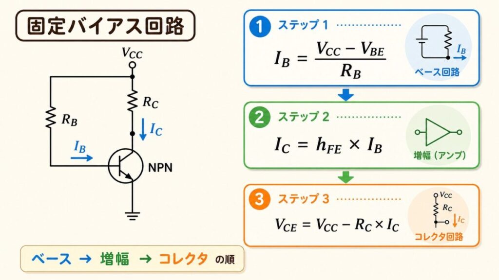 結論を先に言います。バイアス回路の計算は、「ベース側のループでIBを出す → IC = hFE × IB で求める → コレクタ側のループでVCEを出す」という3ステップの繰り返しです。