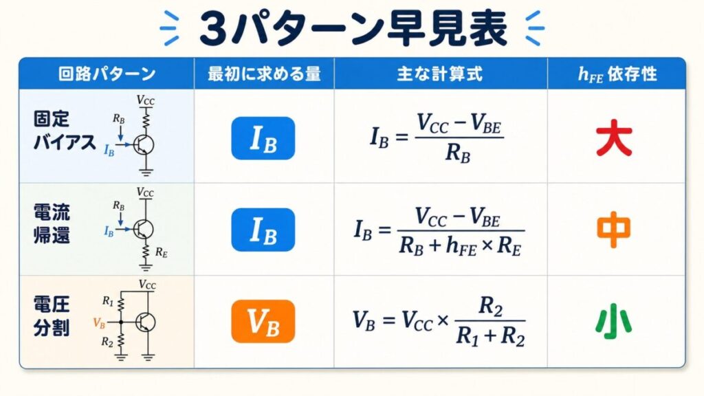 | 回路 | 最初に出す量 | 主な計算式 | hFEの依存 |