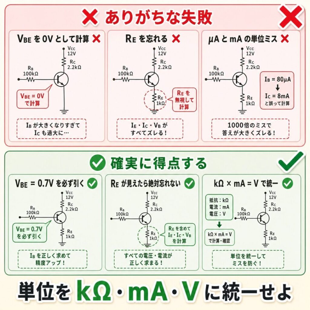 - VBE ≈ 0.7V を必ず引く(忘れがち)