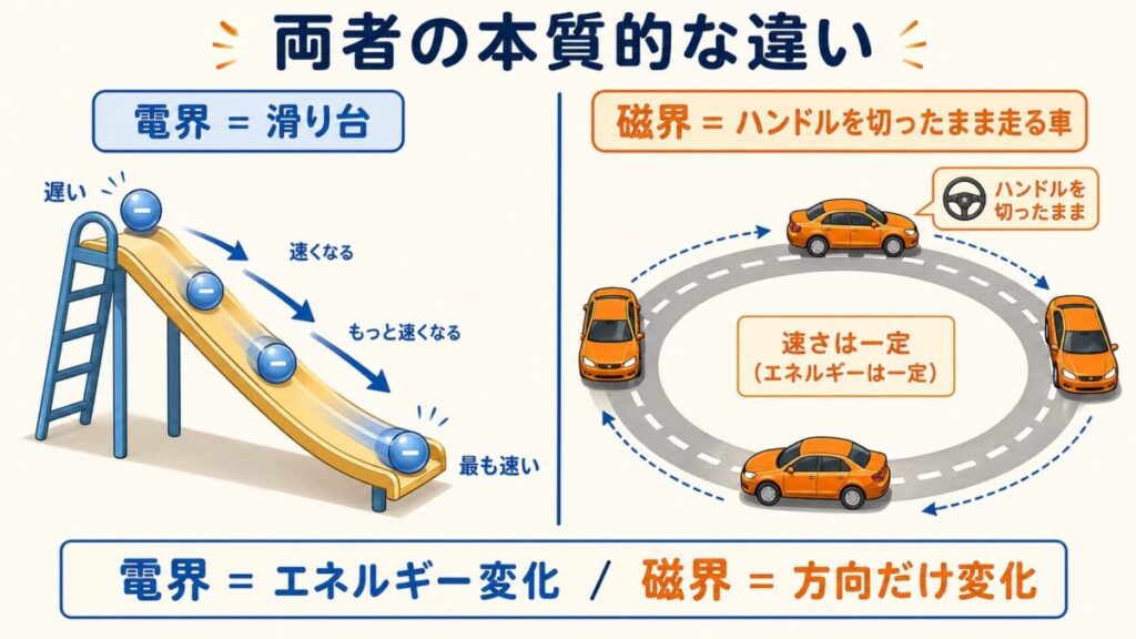 磁界は「ハンドルを切ったまま走る車」のイメージ。スピードは変わらないけど、進路が常にカーブする。