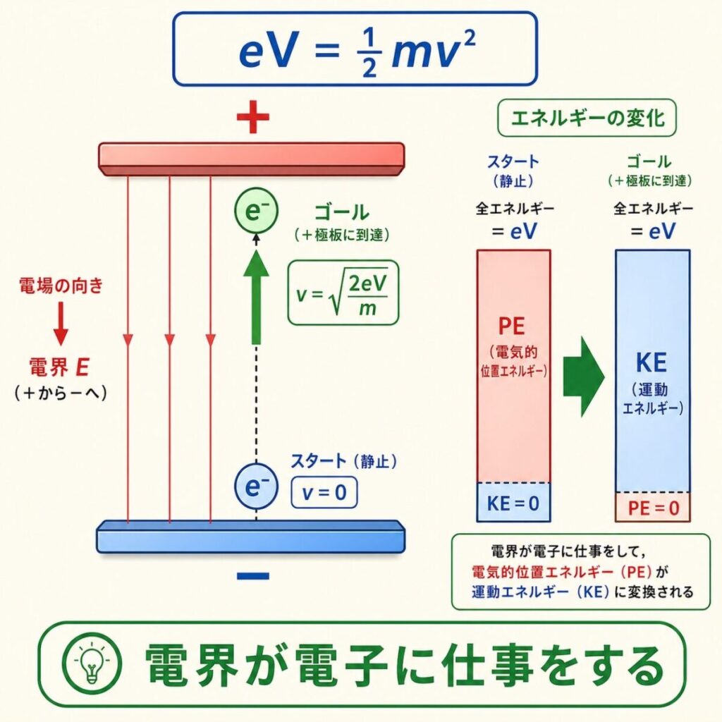 • 電界中の最重要公式:eV = ½mv²(エネルギー保存)