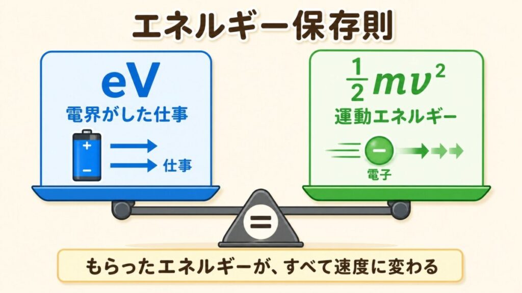 eV = ½mv² は 「ジェットコースターのエネルギー保存」と同じ。位置エネルギー(eV)が、すべて運動エネルギー(½mv²)に変わる、という話。電子も「電界の坂を滑り落ちる」と速くなるのです。