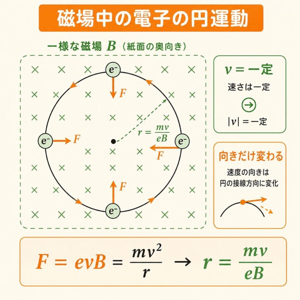 磁界中の電子はローレンツ力 F = evB を受けます。この力は速度に常に直角。だから電子は加速も減速もせず、ただ進路だけが曲がっていく。すると一定の半径で円を描くことになります。