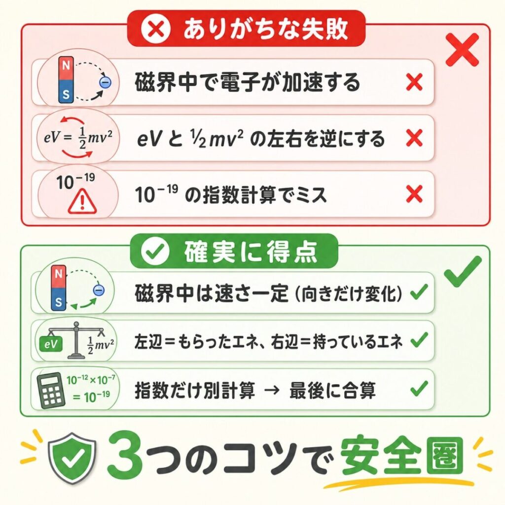 電子の運動の問題は、見た目は複雑そうでも、結局は2つの式(eV=½mv² と r=mv/eB)を順番に使うだけです。「電界=エネルギーをもらう」「磁界=円を描く」という2つの絵を頭に焼き付ければ、もう怖くありません。
