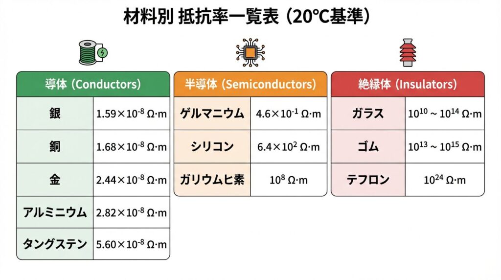 3️⃣ 材料別の抵抗率一覧表(20℃基準)