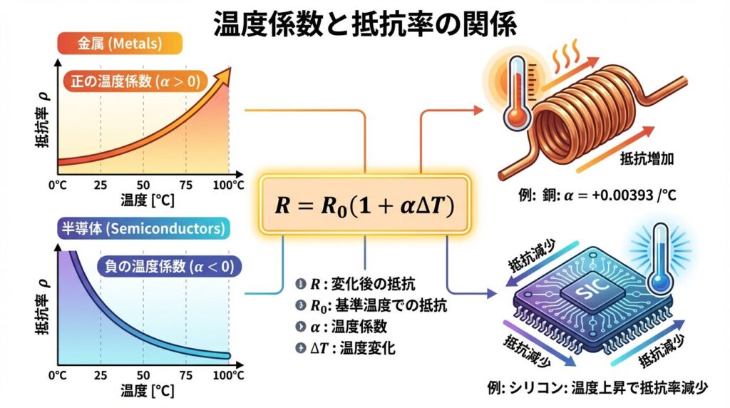 金属は温度が上がると抵抗率が増加(α > 0)します。これは「正の温度係数」と呼ばれます。