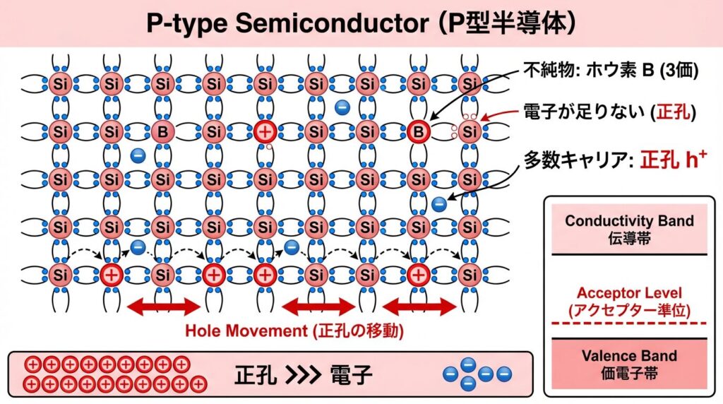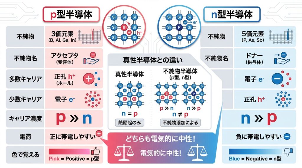 • p型:3価不純物で正孔が多数キャリア(Pink = Positive)