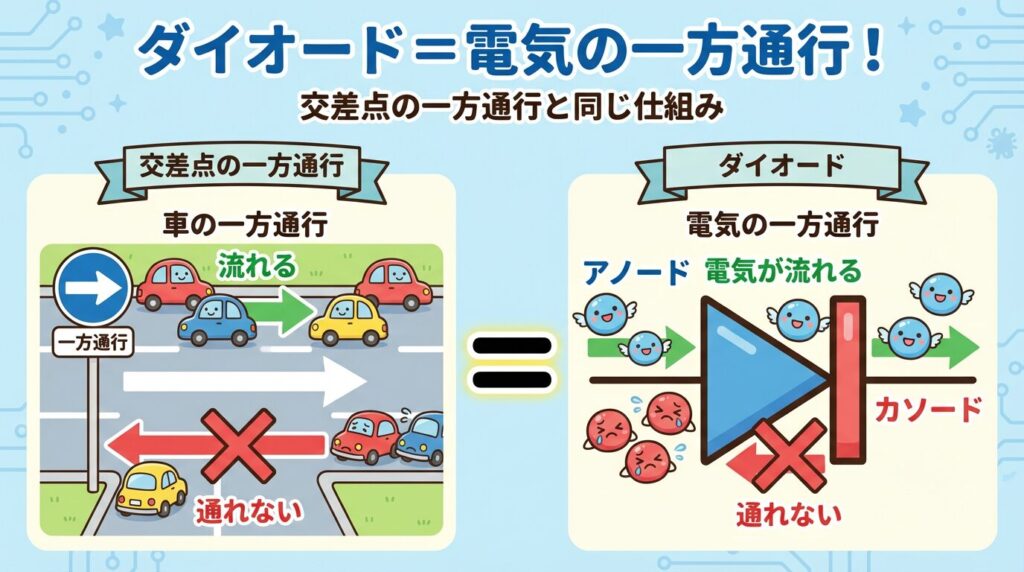 ダイオードは「電気の一方通行」を作る部品です。道路の一方通行と全く同じ仕組みなので、誰でも簡単に理解できますよ!