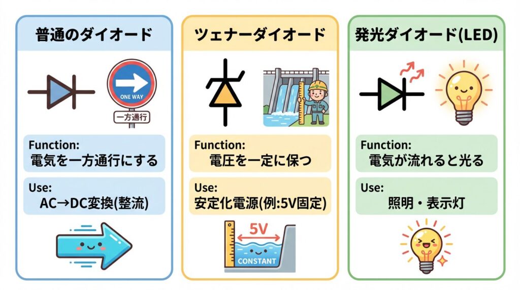 どのダイオードも「一方通行」という基本は同じですが、それぞれ得意分野が違うんですね!
