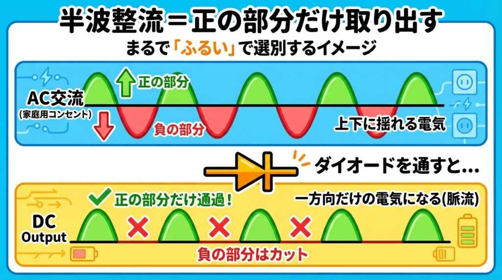 🥄 半波整流|「ふるい」で選別するイメージ
