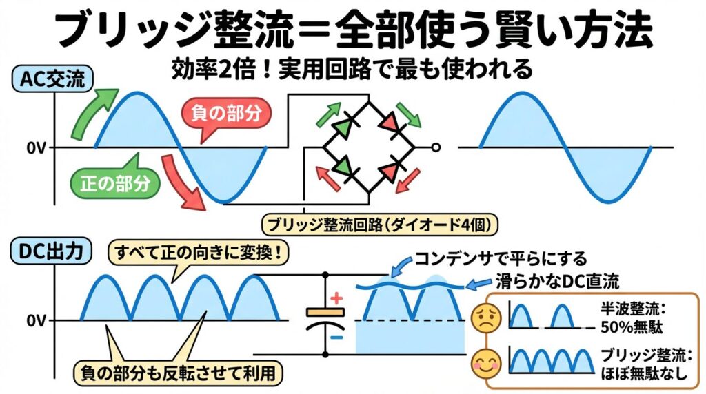 ✅ ブリッジ整流 = ダイオード4個、効率良い