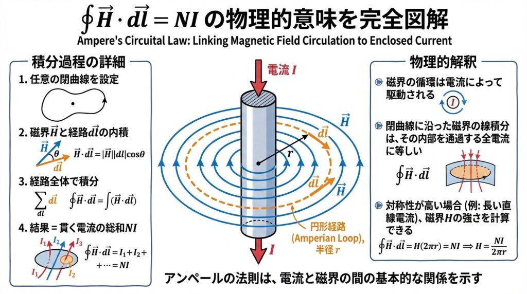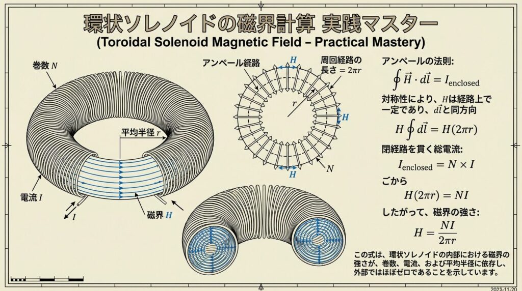 でも安心してください。この記事では、∮H・dl = NI の物理的意味から、無限長ソレノイド・環状ソレノイドの磁界計算まで、まるで目の前で見ているような図解で完全解説します。