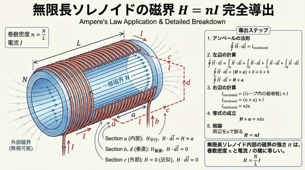 2. 無限長ソレノイド: H = nI(n = N/L、内部磁界一様)