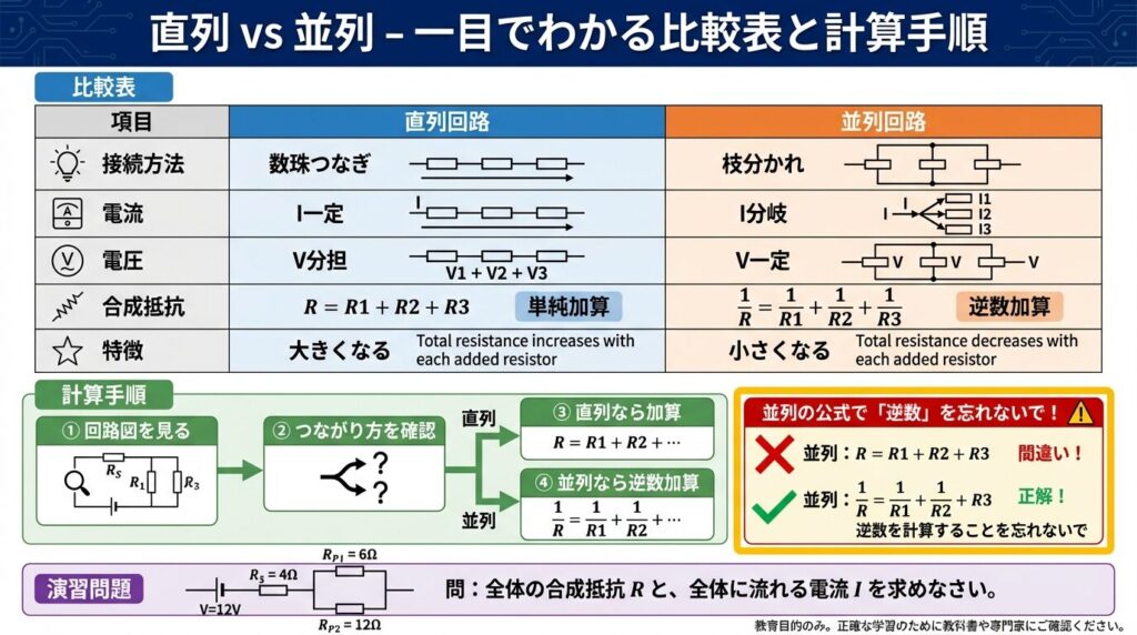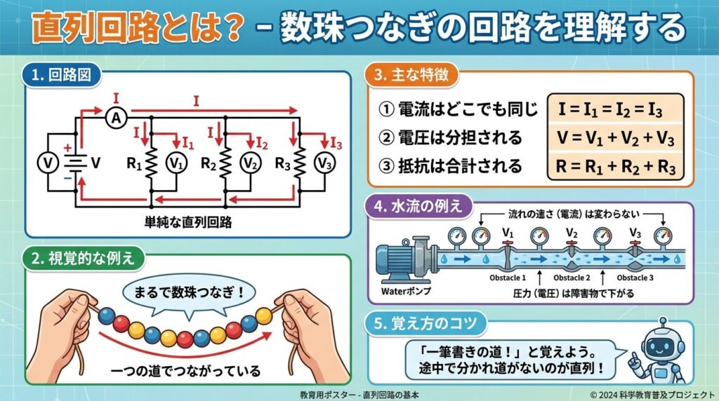 - 直列回路:数珠つなぎ、電流は同じ、電圧は分担、R = R₁ + R₂ + R₃