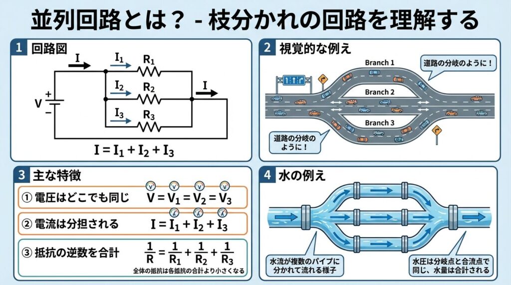 並列回路とは、抵抗などの部品が枝分かれして並んで接続された回路のことです。電流が流れる道が複数あり、電流は分岐して各部品に分かれて流れます。