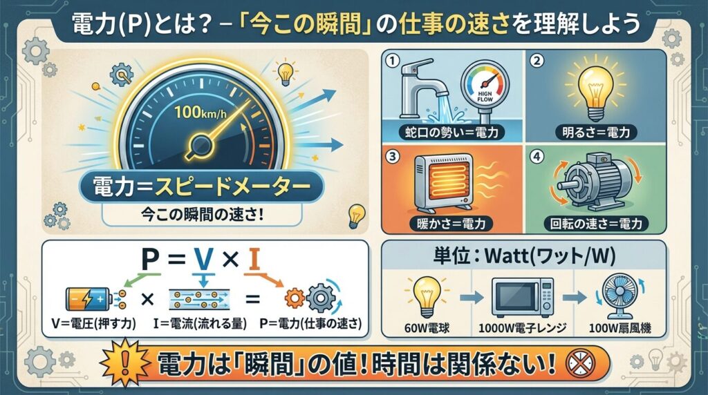 - 電力(P):今この瞬間の仕事の速さ = スピードメーター