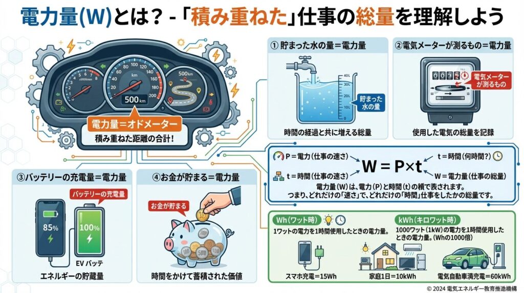 - 電力量(W):積み重ねた仕事の総量 = オドメーター