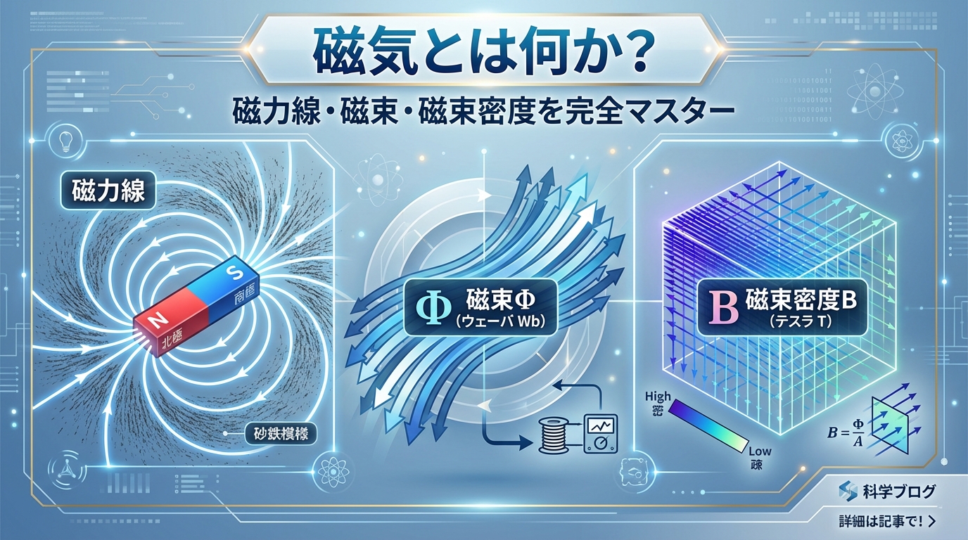 結論から言うと、磁気とは磁石が持つ力のことで、磁力線は磁界を可視化したもの、磁束Φは磁力線の総本数、磁束密度Bは単位面積あたりの磁束です。これらは全て密接に関係していて、理解すれば電磁気学の土台がしっかり固まります。