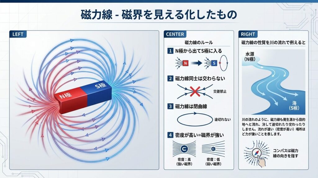 磁力線は実際には存在しない「仮想の線」ですが、磁界の強さや方向を理解するための非常に便利な道具です。