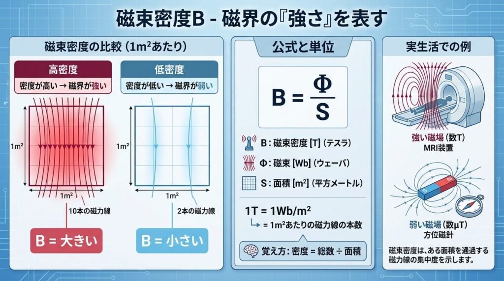 磁束密度とは、単位面積(1m²)あたりに通過する磁束のことです。つまり、「磁力線がどれだけ密集しているか」を表す指標なんですね。記号はB、単位はT(テスラ)を使います。