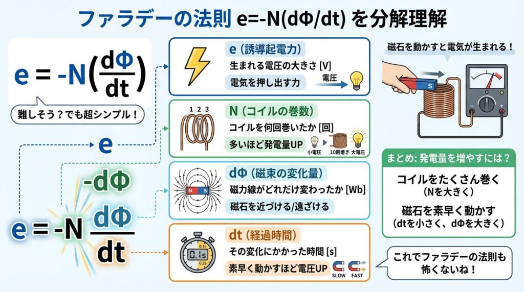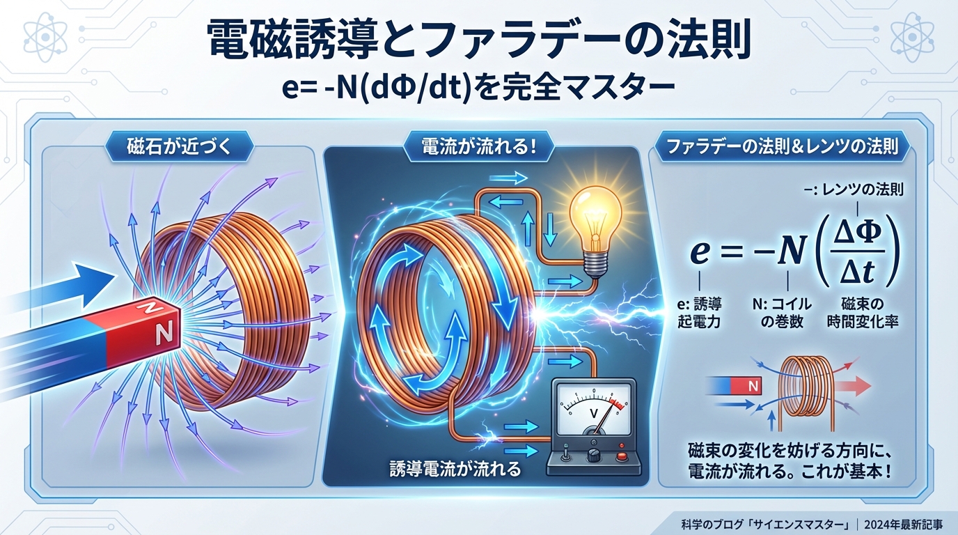 結論から言うと、電磁誘導とは「磁石を動かすと電気が生まれる現象」です。そして、ファラデーの法則 e=-N(dΦ/dt) は、「どのくらいの電圧が生まれるか」を計算する超シンプルな式なんです。