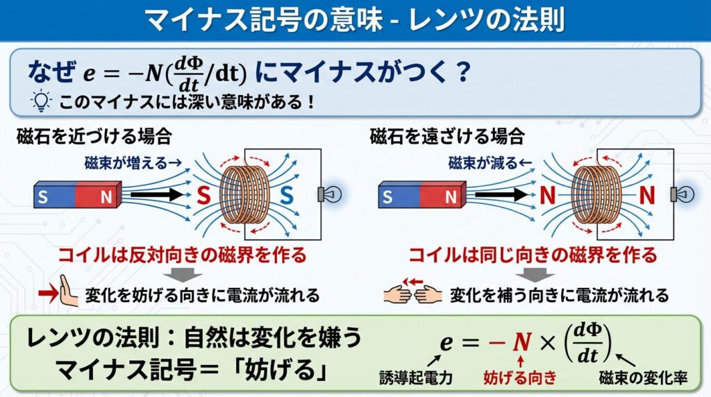 ファラデーの法則 e=-N(dΦ/dt) には、なぜかマイナス記号がついています。「なぜマイナス?」と思いますよね。