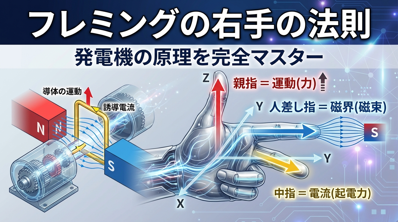 結論から言うと、フレミングの右手の法則は「導体を磁界の中で動かすと電流が発生する」ことを指で示す法則で、これが**発電機の原理そのもの**です。