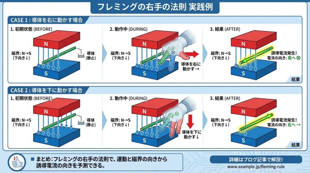 ここでは、具体的な例を2つ見ていきます。導体が動く向きが変わると、電流の向きも変わることを実感してください。