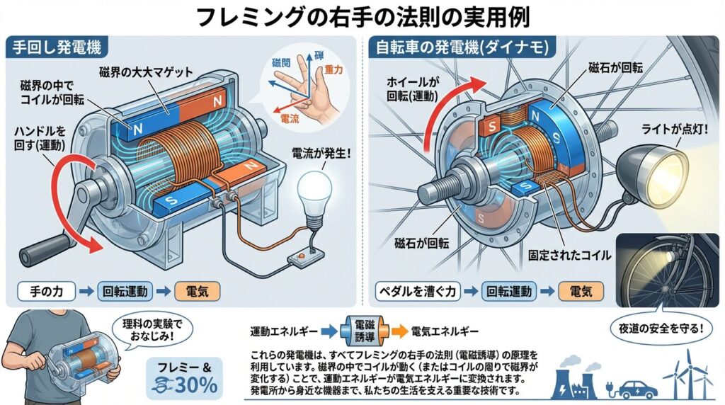 フレミングの右手の法則は、理論だけじゃなく、実際の発電機で毎日使われている原理です。