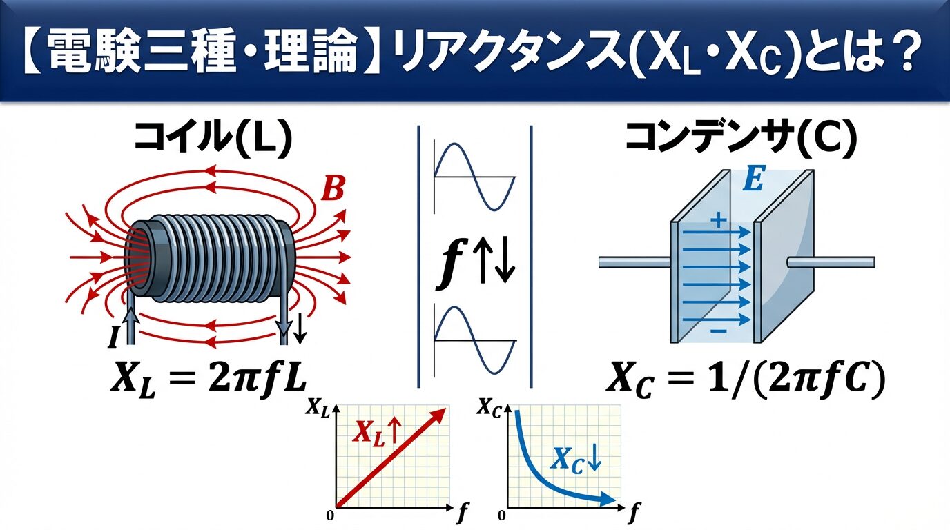 リアクタンスは、コイル(L)やコンデンサ(C)が持つ性質で、周波数(f)によって値が変わるのが最大の特徴です。