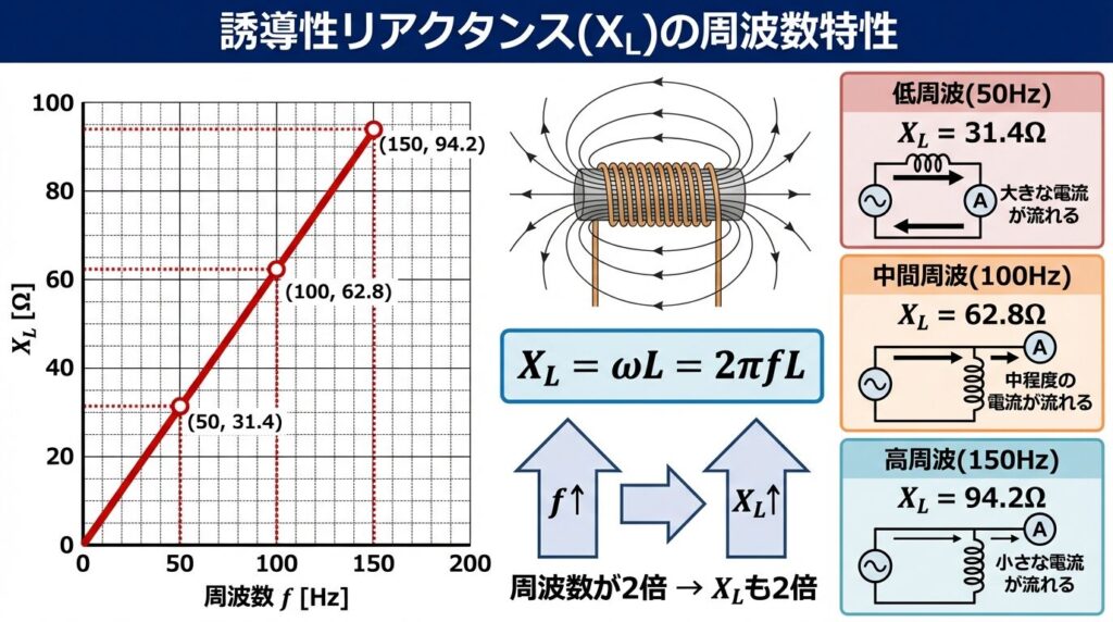 式を見ると、XL = 2πfLなので、周波数(f)が大きくなると、XLも大きくなることがわかります。