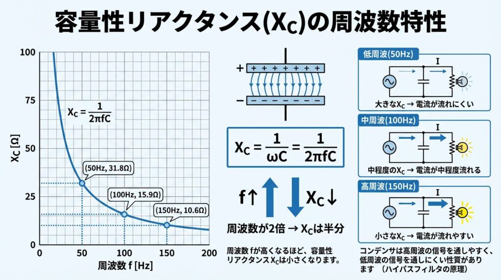式を見ると、XC = 1 / (2πfC)なので、周波数(f)が大きくなると、XCは小さくなることがわかります。