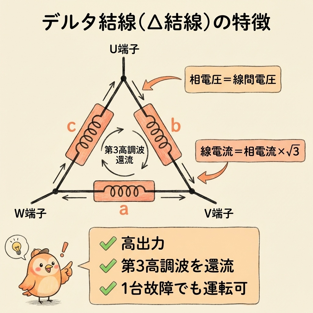 ① 出力が大きい → 同じ電圧でY結線の3倍 ② 第3高調波を還流 → ループ内で打ち消し合う ③ 1相故障でも運転可能 → V結線で継続運転(容量は低下) |