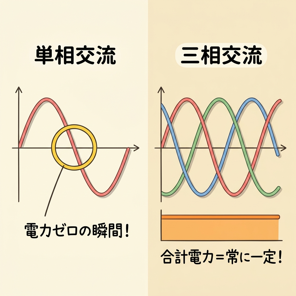 | 瞬時電力 | 脈動する(ゼロになる瞬間がある) | 常に一定 ✨ |