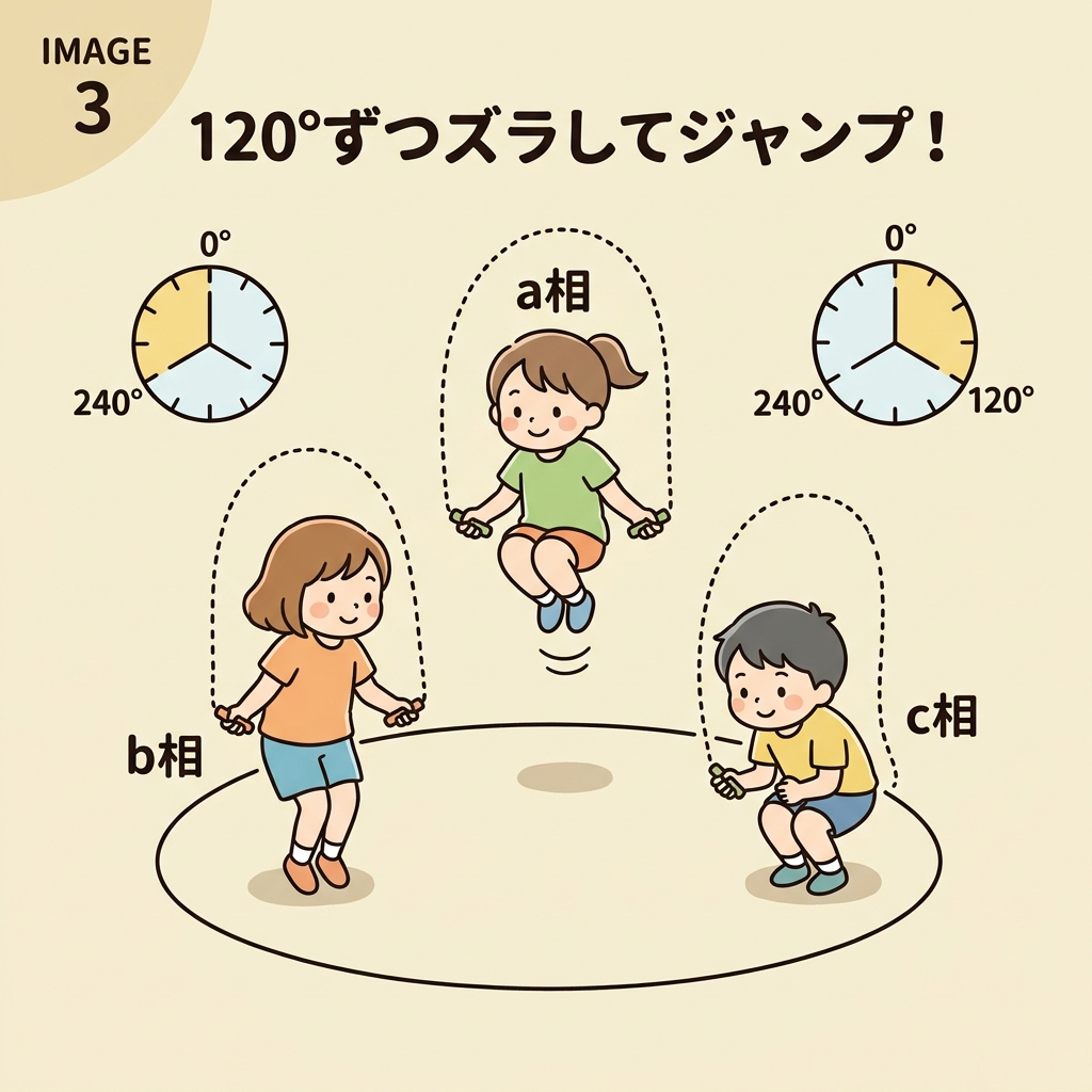 3人が均等なタイミングで跳ぶから、地面に伝わる振動は一定に近づきます。全員が同時にドン!と跳ぶよりも、交互にトン・トン・トンと跳ぶ方が、地面への衝撃が分散されて滑らかになりますよね。これが三相交流の「パワーが安定する」理由のイメージです。