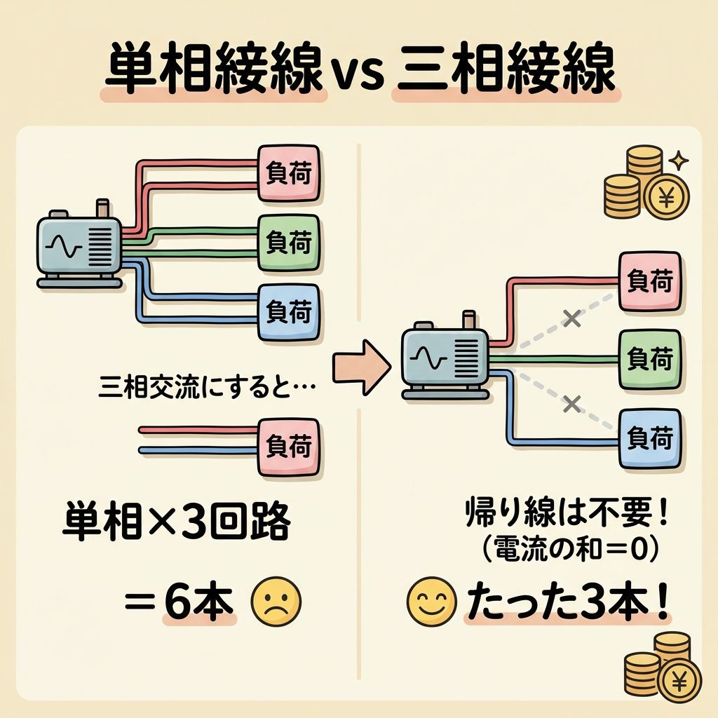 | 電線3本の理由 | 3つの電流の和が常にゼロ → 帰り線が不要 |