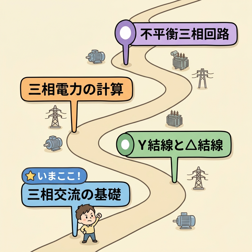 三相交流分野の学習は、以下のステップで進めるのが効率的です。