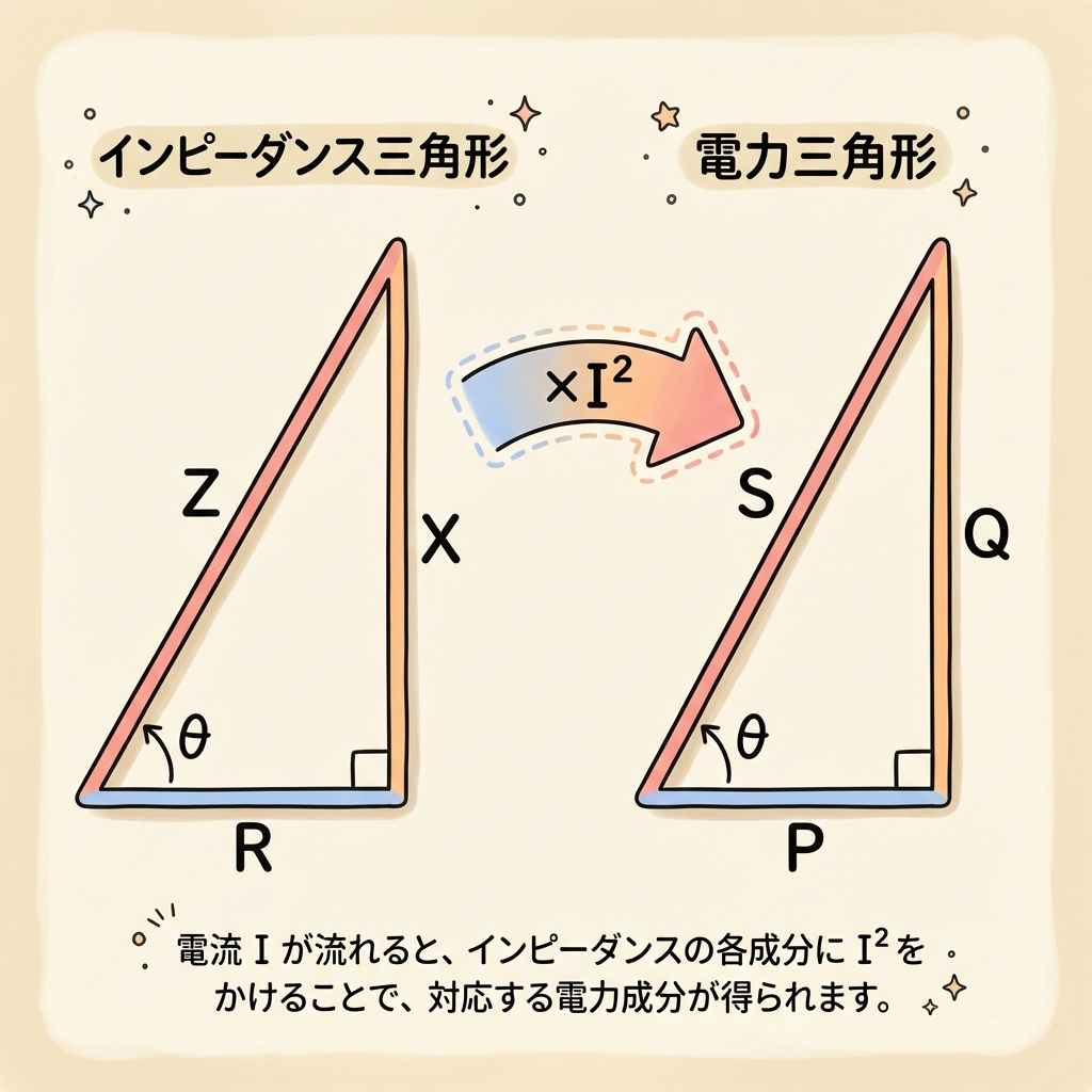 つまり、インピーダンス三角形の各辺にI²を掛けると、電力三角形に変身するのです。逆に言えば、回路のR・X・Zがわかれば、I²を掛けるだけでP・Q・Sも即座に求まります。