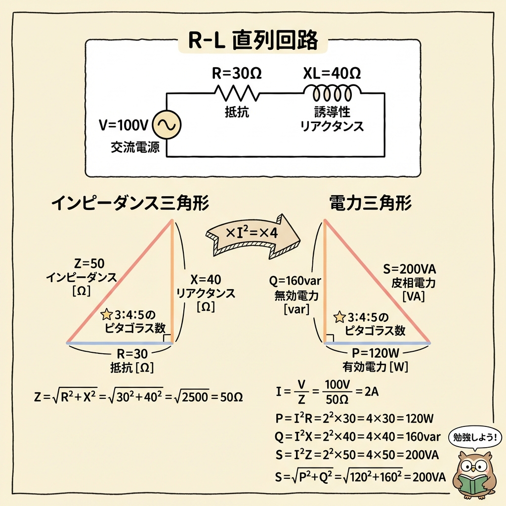 電力三角形と完全対応するインピーダンス三角形を徹底解説。Z=√(R²+X²)の導出から計算例まで。