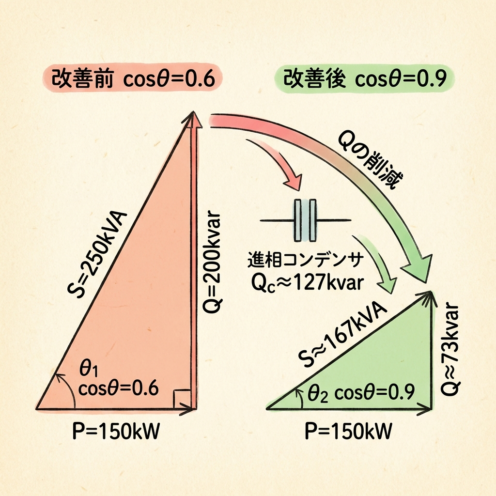 改善前 S = 250 kVA → 改善後 S ≈ 167 kVA。約33%も減少しました。これは「電線を流れる電流が33%減った」ことを意味します。電線の損失(I²R)は電流の2乗に比例するので、損失は 約55%減少 する計算です。力率改善の効果がいかに大きいかがわかりますね。