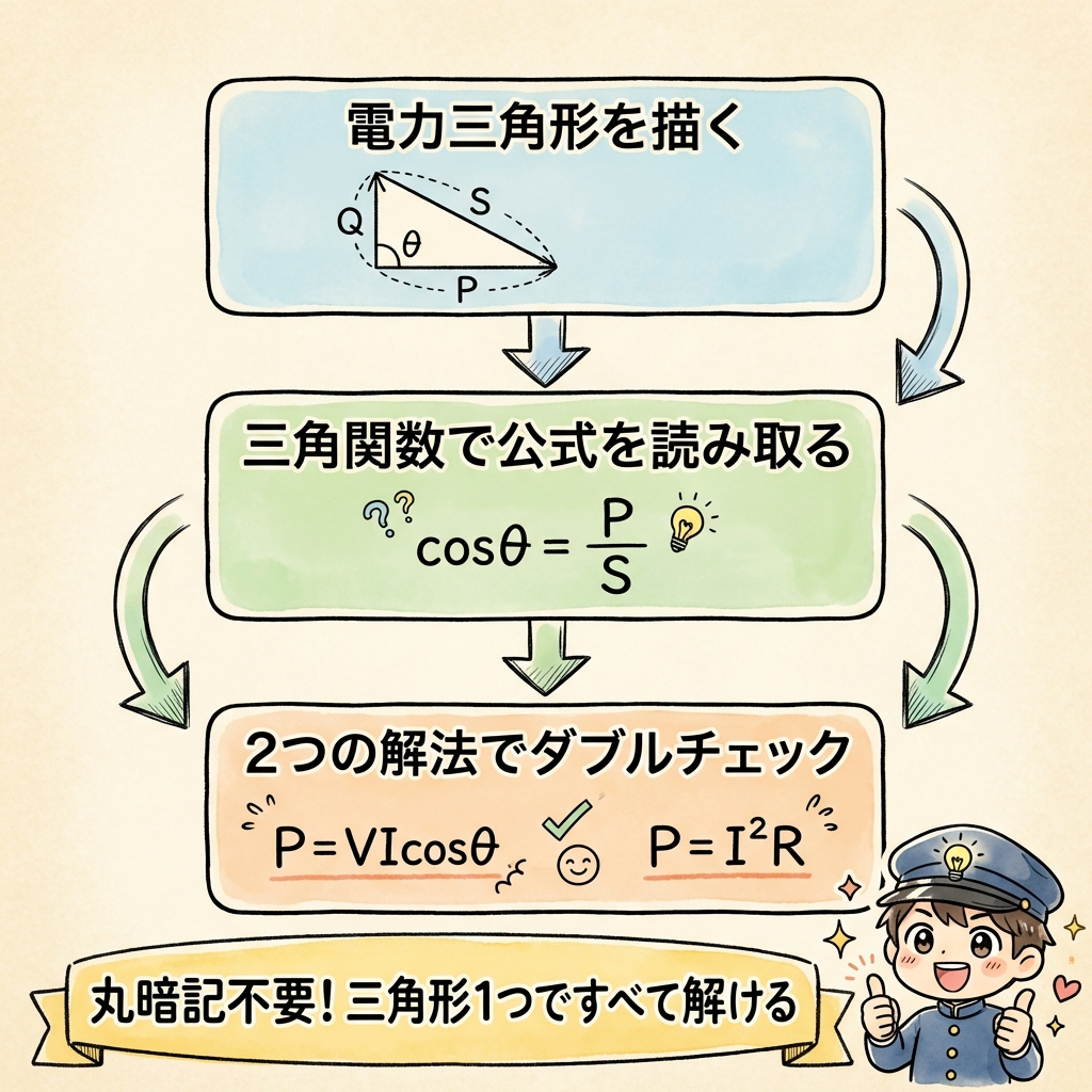直角三角形を描いて「底辺÷斜辺 = cosθ」「高さ÷斜辺 = sinθ」と読み取るだけ。三角関数の定義そのものなので、忘れようがないのです。試験本番では、まず電力三角形をメモ用紙に描くことから始めましょう。